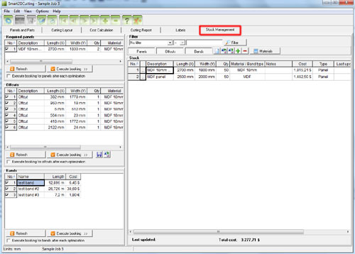 Management" tab in the main window. The Stock Management role is to help you to keep track of used panels, bands and reusable offcuts. The "Stock Management" window is made up of 2 sections: