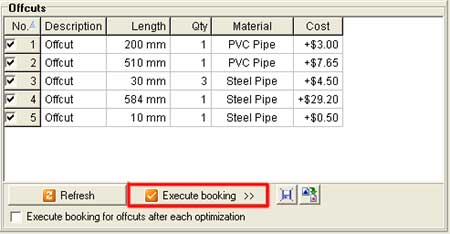 To launch the booking procedure for offcuts click the "Execute booking >>" button from the "Offcuts" section. The booking process for offcuts can be automated by checking the option "Execute booking for offcuts after each optimization". To reset the "Offcuts" list to its initial state click the "Refresh" button from the "Offcuts" section. |
