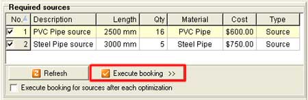 To launch the booking procedure for sources click the "Execute booking >>" button from the "Required sources" section. The booking process for sources can be automated by checking the option "Execute booking for sources after each optimization". To reset the "Required sources" list to its initial state click the "Refresh" button from the "Required sources" section. Please note that once executed, the booking process can not be undone! |